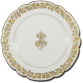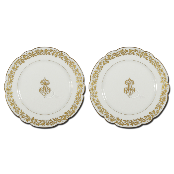 Fazenda Resgate. Par de pratos rasos de porcelana, bordas onduladas; abas delimitadas por filetes dourados e decoradas com folhas, em relevo; nas caldeiras, iniciais JR, pertencente a João Álvares Rubião Jr., também em dourado; no verso de cada prato, marcas de Hacche Jullien & Cie - Paris; 22 cm de diâmetro, cada. França, séc. XIX. João Álvares Rubião Jr. foi casado com Guilhermina de Almeida Vallim, e foram proprietários da Fazenda Resgate, em Bananal. Um prato apresenta bicado na borda e fio de cabelo.