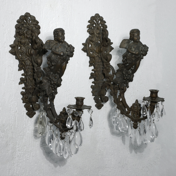 Par de apliques, para uma luz cada, de bronze patinado. Europa, século XX. Par de apliques, para uma luz cada, de bronze patinado. Braço com vazados, ornado com volutas e folhas de acanto, sustentando pingentes de cristal transparente e incolor, encimado por figura de "Putti" segurando e envolto por elementos da videira; 39 cm de comprimento e 41 cm de altura total. Europa, século XX. Apresentam marcas do tempo e uso.
