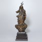 Nossa Senhora do Rosário - Brasil, século XVIII. Imagem de madeira esculpida e policromada, com vestígios de douração, representando Nossa Senhora com cabelo parcialmente caindo sobre os ombros e coberto por véu. Bom e movimentado panejamento, braço direito flexionado com a mão em posição para sustentação de rosário e o esquerdo com mão espalmada sob manto para apoio do Menino Jesus, sentado. Flutuando sobre nuvens com quatro cabeças de anjos e base retangular escalonada; 50 cm de altura total, com a coroa de prata de 5 cm de altura. Estão ausentes os atributos desta iconografia, O Menino Jesus e o rosário. Apresenta pequenas perdas na policromia. Origem: espólio de Cárbia Sabatel Bourroul e José Celestino Monteiro de Barros Bourroul.
