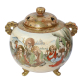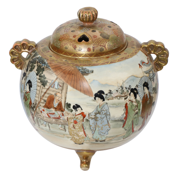 Queimador de incenso Hododa. Japão, Era Meiji (1868–1912), c. 1880–1910. Queimador de incenso de porcelana policromada e dourada no padrão Satsuma. Corpo bojudo trípode, inteiramente decorado com paisagens, gueixas e cenas do cotidiano; dois pegas verticais diametralmente opostos e tampa com três furos cordiformes. Ideogramas japonês no reverso do fundo, símbolo auspicioso de oferenda; 15,8 cm de altura total. Um dos pés, apresenta colagem ou fio de cabelo em seu entorno.