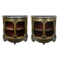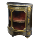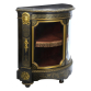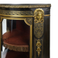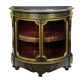 Par de Vitrines à Maneira de Andre Charles Boulle. França, século XIX. Estrutura e tampo semiglobosos de madeira ebanizada. Tampo escalonado e avançado com borda guarnecida por faixa de bronze ornada em relevos por volutas e elementos da rocalha. Corpo com duas portas anteriores centralizando vidro bombê transparente e molduradas em dourado, encerrando vão livre com uma prateleira ornada com franja dourada de tecido tresse. Internamente revestido com veludo bordô. Profusa incrustação de filetes metálicos em composições variadas. Nos cantos superiores rosto feminino circundado por arranjos florais, de bronze dourado e modelado na figura de indiana; nos inferiores, rosácea. Nas extremidades pés de bolacha, circundados por faixa de bronze e terminados em ponteiras cilíndricas de madeira. Na parte posterior e próximo ao tampo dois furos com proteção metálica, simétricos e opostos, para fixação na parede; 102 cm de comprimento, 44 cm de largura e 103 cm de altura total. Provavelmente, por segurança e a fim de evitar a fixação na parede, outrora foi adicionado, na parte anterior e central do móvel, um terceiro pé retangular, também de madeira. Em função da época e uso estão ausentes alguns poucos filetes metálicos, sem comprometer a beleza, estética e harmonia do conjunto.