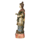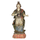 Santa Luzia. Brasil, Minas Gerais, Século XVIII. Imagem de madeira esculpida, com policromia e douração, apresentando a santa em pé; cabeleira disposta em coque preso por fitilho dourado acima da cabeça, e deixada solta, nas costas, com discreto movimento lateral. Veste meia armadura e, cobrindo as costas; manto vermelho em suave movimento e ornamentado com extremidades douradas e aplicações de adornos florais. Frontalmente, mantelete em policromia floral sobre fundo branco, se sobrepõe ao manto, concluso, junto à base por gracioso drapeado; 37,5 cm de altura total. Estão ausentes os atributos.