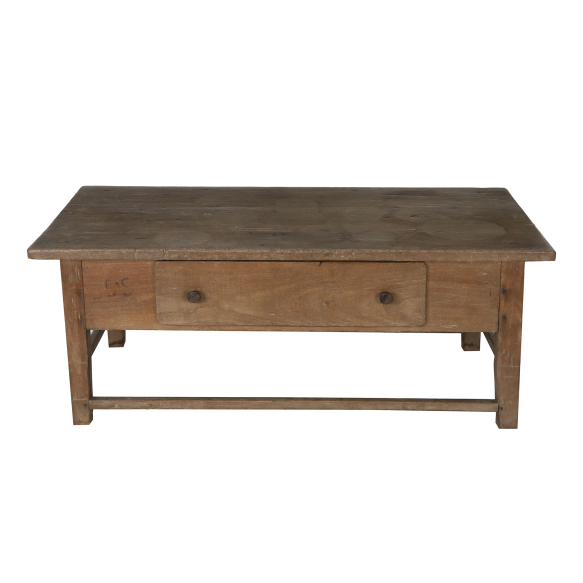 Mesa de centro de madeira nobre - Brasil, século XX. Mesa de centro de madeira nobre e rústica encerada. Tampo retangular encimando caixa com uma gaveta central com dois puxadores torneados e quatro pernas de perfis retos unidos abaixo por quatro traves; 137,5 cm de comprimento, 67 cm de largura e 56 cm de altura total. Origem: espólio de Cárbia Sabatel Bourroul e José Celestino Monteiro de Barros Bourroul.
