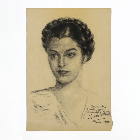 Artista não identificado. Retrato de Roberta. Lápis crayon sobre cartão, 48,5 cm x 34 cm. Assinado e dedicado embaixo à direita: A Senhorinha / Roberta, com / admiração oferece / S.... Botelho/ Maio - 1940. Origem: ex-coleção Embaixador José Roberto de Macedo Soares.