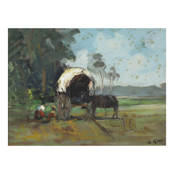 Renzo Gori. No Interior do Paraná. Óleo sobre tela, 30 cm x 40 cm. Datado e assinado embaixo à direita: 77 Gori. No reverso inscrição: No interior do / Paraná.