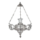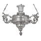 Lampadário de metal - Brasil, século XX. Lampadário de metal, espessurado de prata, repuxado e burilado. Corpo circular e liso ornado em seções com faixas aneladas concêntricas à base com terminação em pião. Três braços projetados e com vazados delimitando volutas encimadas por figura feminina sentada, sustentando correntes reunidas ao topo a suporte almofadado. Sem marcas de identificação aparentes; 100 cm de altura total. Origem: espólio de Cárbia Sabatel Bourroul e José Celestino Monteiro de Barros Bourroul.