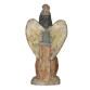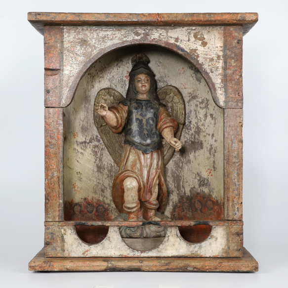 São Miguel Arcanjo - Brasil, século XVII. Escultura de barro queimado e policromado representando o Santo em sua iconografia tradicional. De pé sobre nuvens, com asas, cabelos longos, trajes convencionais, braços ligeiramente flexionados acima da cintura e mãos em posição de sustentar balança e lança; 50 cm de altura total. Apresenta-se no interior de oratório de madeira, com vestígios de policromia, da mesma época, com alguns restauros; em seu interior pintura de almas do purgatório. Estão ausentes nesta iconografia, a balança com seu prato e a lança com estandarte.