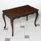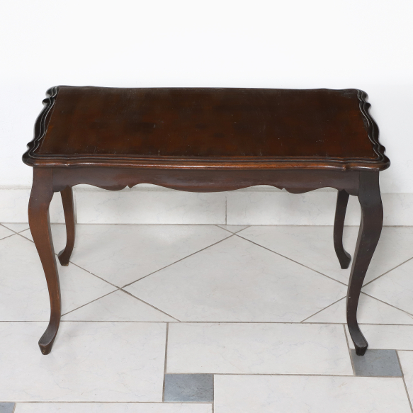Mesa de centro - Brasil, século XX. Mesa de centro de madeira nobre envernizada. Tampo retangular de borda movimentada, assim como sua saia, sobre quatro pernas recurvas terminadas em ponteiras; 74 cm de comprimento, 44 cm de largura e 47 cm de altura total. Origem: espólio de Cárbia Sabatel Bourroul e José Celestino Monteiro de Barros Bourroul.