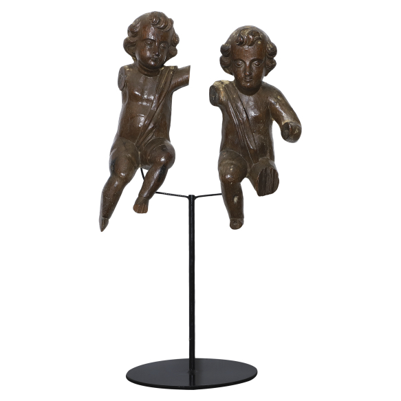 Dois Anjos de madeira entalhada e encerada, com vestígios de policromia. Ambos com cabelos encaracolados, desnudos com faixa transversal iniciada no ombro e rematada na pelve. Suspensos por estrutura metálica com base circular, patinada de preto; 40 cm e 43 cm de alturas, respectivamente; 73,5 cm de altura total. Brasil, séc. XVIII. Ausentes partes de pés, pernas e braços. Origem: espólio de Edgar Clat Gaspar.