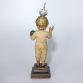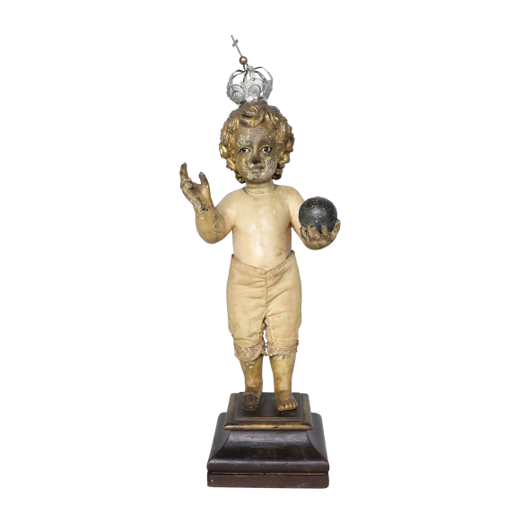 Menino Jesus de Praga - Brasil, século XVIII. Imagem de madeira policromada e dourada apresentando o Menino Jesus de pé, vestido com calça de tecido, cabelos encaracolados, olhos de vidro, braço direito com mão em posição de benção e o esquerdo flexionado segurando a Esfera Mundi. Base retangular elevada; 46, cm de altura total, com coroa filigranada de prata de 7,5 cm de altura. Apresenta perda dos dedos do pé direito, assim como perda de parte da policromia do rosto. Origem: espólio de Cárbia Sabatel Bourroul e José Celestino Monteiro de Barros Bourroul.