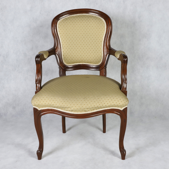 Cadeira de braço estilo Louis Philippe de madeira nobre, encosto e assento estofados braços recurvos, pernas levemente arqueadas com pés em cachimbo; 100 cm de altura. Brasil, século XX. Origem: espólio de Cárbia Sabatel Bourroul e José Celestino Monteiro de Barros Bourroul.