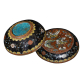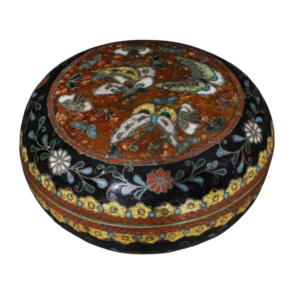 Kõgõ. Japão, Período Meiji (1868 - 1912). Pequena caixa metálica, esmaltada e policromada com decoração de elementos fitomórficos em cloisonné; internamente esmalte azul-turquesa; 8,5 cm de diâmetro e 5 cm de altura total. Kõgõ - pequena caixa para incenso usada em cerimônias.