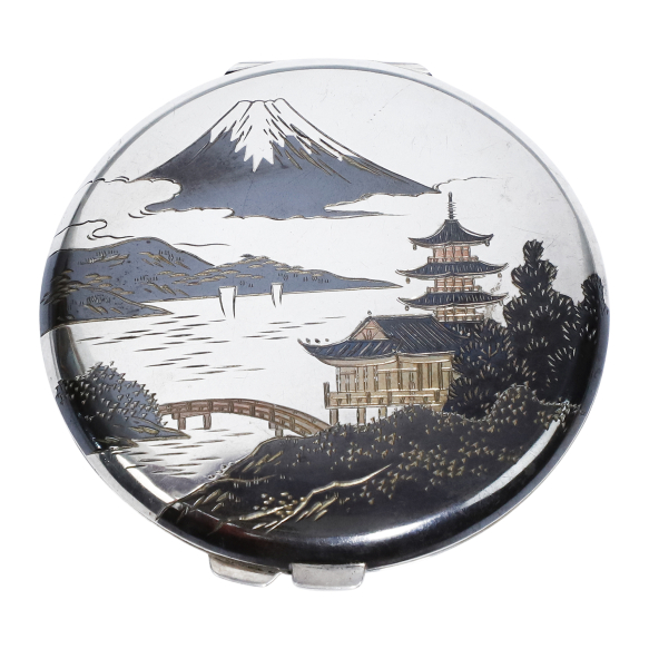 Poudrier de Prata. Japão, Início Século XX. Poudrier de prata toer 950. Corpo circular ornado, em seu tampo, com pagode em cena lacustre. No reverso: ideograma japonês e silver / 950.