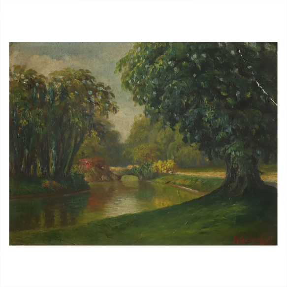 Correa Costa, A. Parque com Riacho e Árvores. Óleo sobre tela, 26 x 33 cm. Assinado embaixo à direita: A. Correa Costa. Apresenta descascados no canto superior direito.