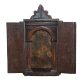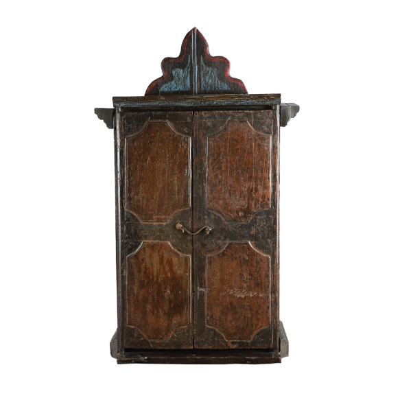 Oratório de madeira nobre entalhada, com vestígios de verniz. Duas portas almofadadas encerrando vão com parte posterior ornada com policromia de flores de Malabar; 51 cm de comprimento, 28 cm de profundidade e 83,5 cm de altura total. Brasil, séc. XIX.