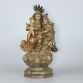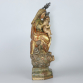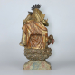 Santas Mães. Brasil, século XVIII. Grupo escultórico de madeira policromada e dourada, esculpido em um só bloco. Sant'Ana encontra-se sentada, com a Virgem Maria de pé à sua esquerda segurando globo com a mão direita, e o Menino sobre sua perna direita, com a mão esquerda sobre o globo. Ambas trajando longo manto esvoaçante com dobras acentuadas, verde e dourado com detalhes em vermelho encarnado, que se estendem aos pés. Cabelos encobertos por véu, cabeças e olhares voltados para baixo. O todo sobre nuvem com anjos alados e base facetada; 51,2 cm de altura total, com resplendor de 5 cm de altura. Acompanha coroa de prata e dois resplendores, sendo um também de prata e outro dourado.