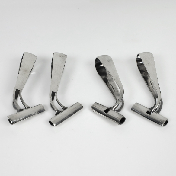 Quatro pinças individuais para aspargos, de metal espessurado à prata. Duas lâminas longitudinais e paralelas com suporte retilíneo e semicircular nas pontas curvas que, quando comprimidas, abrem-se para pega do vegetal. Na parte interna das lâminas marcas de identificação, do fabricante: Mappin & Webb. Inglaterra, séc. XX.
