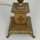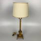 Abajur de metal com cúpula bege - Brasil, século XX. Abajur, com coluna e haste de metal patinado de marrom, e base metálica dourada sobre quatro pés em volutas, como se castiçal fosse; 72 cm de altura total ou 53 cm, sem a cúpula de tecido bege. Origem: espólio de Cárbia Sabatel Bourroul e José Celestino Monteiro de Barros Bourroul.