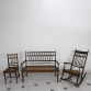 Conjunto de móveis para sala de visitas - Brasil, início século XX. Conjunto de móveis para sala de visitas de madeira nobre, composto de 10 peças: 1 sofá de dois lugares, com proteção de acolchoado revestido de tecido bege, medindo 125 cm de comprimento, 54,5 cm de largura e 99 cm de altura total; 8 cadeiras sem braços e 1 cadeira de balanço com 83 cm e 106 cm de alturas dos espaldares, respectivamente. Todas as peças com as mesmas características: espaldares vazados e ornados com colunelos em balaústres; assentos de palhinha; 4 pernas, sendo as anteriores torneadas e terminadas em ponteiras e as posteriores retangulares e ligeiramente curvas, unidas por traves fusiformes. Origem: espólio de Cárbia Sabatel Bourroul e José Celestino Monteiro de Barros Bourroul.