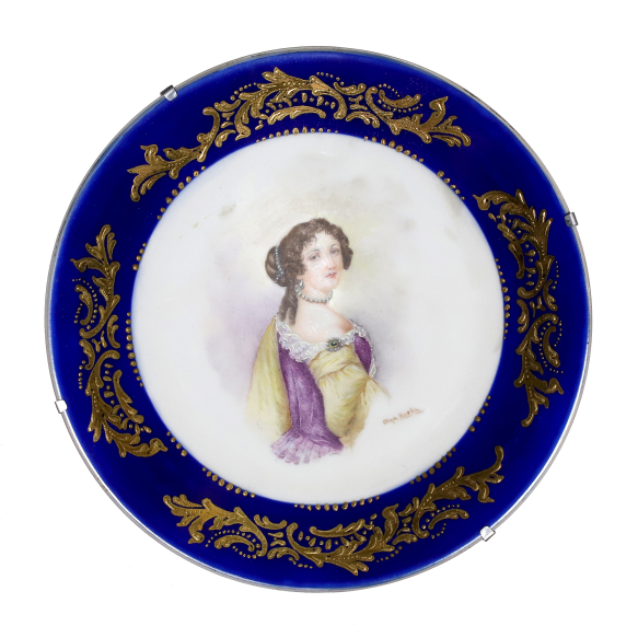 Prato de porcelana, aba azul cobalto decorada por volutas em dourado, caldeira com busto de Madame de Maintenon em policromia, assinada embaixo a direita Olga Borba, no reverso marca de Charles Ahrenfeldt Limoges; 22 cm de diâmetro. França, início séc. XX. Olga Borba Foi uma das preferidas do Rei Louis XIV.