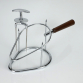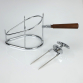 Porta-assados vintage. Estados Unidos, século XX. Porta-assado víntage de aço inoxidável, estrutura tubular e formato ovoide. Base com quatro espetos cilíndricos, unidos acima e próximos às suas pontas, por apoio inclinado para o assado. Cabo de madeira torneada; 42 cm de comprimento, 16 cm de largura e 18 cm de altura total. Acompanha utensilio trinchante, de mesmo material.