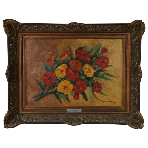Tadashi Kaminagai. Natureza Morta com Flores. Óleo sobre tela, 50 cm x 70 cm. Assinado e datado embaixo à direita: T. Kaminagai 1962. No reverso assinado, localizado e datado: T Kaminagai / Rio 1962.