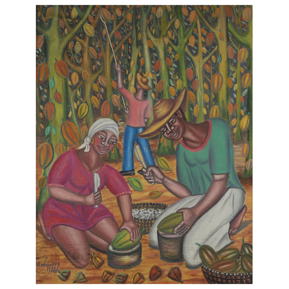 Rodrigues. Colheita de Cacau. Óleo sobre tela, 70 cm x 56 cm. Assinado e datado embaixo à esquerda: Rodrigues/88. Assinado, datado e localizado no verso.