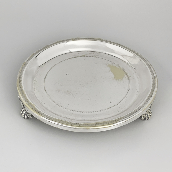 Salva de metal espessurado de prata - Brasil, século XIX/XX. Salva de metal espessurado de prata, estilo D. Maria. Formato circular ornada na aba e no plano com faixa guilhochada; três pés de garras; 26,2 cm de diâmetro. Sem marcas aparentes de identificação. Em função da época e do uso apresenta pequenas perdas na prateação. Origem: espólio de Cárbia Sabatel Bourroul e José Celestino Monteiro de Barros Bourroul.