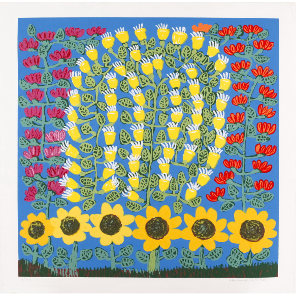 Antônio Poteiro - Flores com Girassóis - 85 x 85 cm - Gravura sem Moldura - Ass. Canto Inferior Direito - Exemplar 41/190 - Apresenta pequenas dobras nas bordas e pequenos rasgos na borda direita