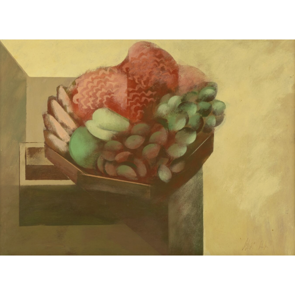 EspañolCarlos Scliar - Gamela com Frutas e Flores – 55 x 75 cm – Vinil Encerado sobre Tela sobre Madeira – Ass. Canto Inferior Direito e Dat. 1971