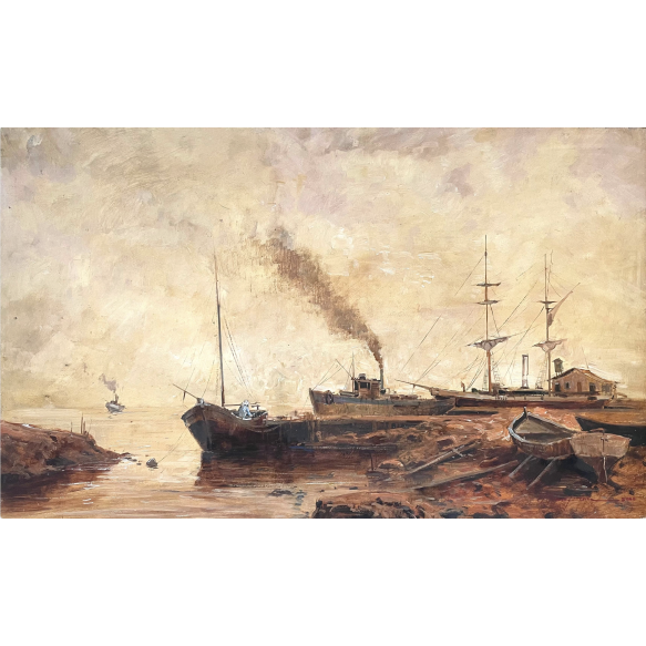 EspañolMauro Ferreira - Mauro Ferreira - Cais de Desembarque - 46 x 75 cm - Óleo Sobre MDF - Ass. Canto Inferior Direito e Dat. 2000
