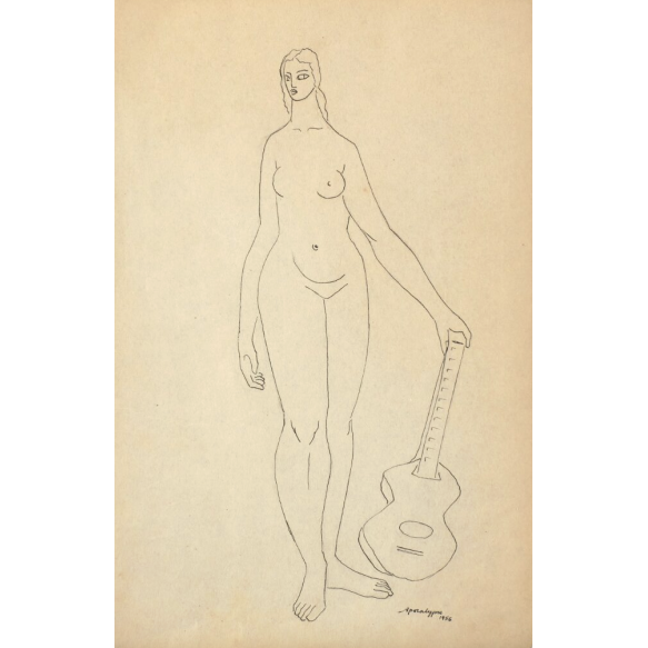 EspañolÁlvaro Apocalypse - Mulher com Violão - 22,5 x 14,5 cm – Nanquim – Ass. Canto Inferior Direito e Dat. 1956