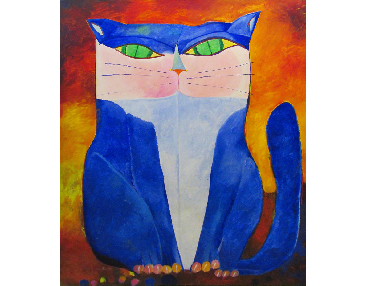 Aldemir Martins acrílica sobre tela 130 x 100 cm “Gato Azul” ass e datada CIE E Verso 1990 com cache Galeria Marques.