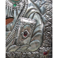 SÃO PEDRO Inscrições verticais: O´ΑΓΙΟΣ ΠΕΔTΟΣ - Ícone Grego em têmpera sobre madeira e "Oklad" em prata de lei, ricamente cinzelada e repuxada, aplicações de pedras vermelha. Banho de ouro "Vermeil" no resplendor. Marcado com a "Cruz em P"*, Contraste e teor 950 mls., Europa século XIX. Medidas: 15 x 20 cm. DA DEVOÇÃO: O líder dos doze apóstolos e o fundador da Igreja de Antioquia. Ele também é considerado fundador da Igreja de Roma e, portanto, o primeiro papa. ***SIGNIFICADO DA CRUZ EM P: É uma cruz estilo CHI-RHO ou SHI-RHO, é um "Cristograma" usado até antes mesmo do Imperador Constantino, mas só ganhou popularidade quando Constantino usou este símbolo no seu lábaro ou estandarte, a letra ''A' e ''O'' significam "Alfa e Ômega", o princípio e o fim. A letra ''P'' significa as iniciais das letras gregas ''XP' que é CRISTO, este símbolo também era usado por pagãos para marcar livros ou partes do livro como importante.
