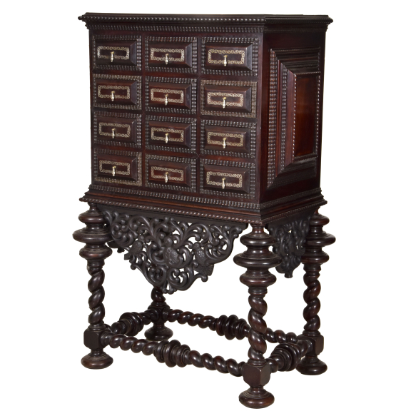Móvel Contador - Portugal, século XVIII. Móvel contador manuelino de jacarandá (Praticamente idêntico ao português do acervo histórico do Palácio do Governo do Estado de São Paulo de Campos dos Jordão. Caixa de formato retangular, ornamentada por frisos em tremidos, com doze gavetas almofadadas distribuídas em quatro níveis, alinhadas três a três e decoradas com friso retangular de volutas, em metal amarelo; puxadores metálicos em pingentes. Ilhargas também almofadadas com molduras escalonadas e em tremidos. Saias, frontal e laterais, com vazados delimitando ramagens e pássaros. Quatro pernas retas, assim como as quatro traves que as une, em torcidos com bolachas. Medidas: 153,5 x 103 x 67 cm.