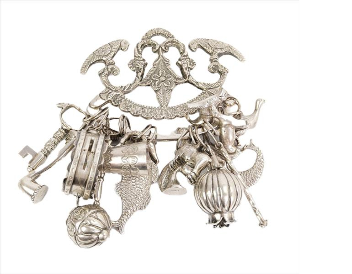 Penca baiana de prata-de-lei, ricamente decorada com diversos penduricalhos representando frutos, animais, objetos e sereia.