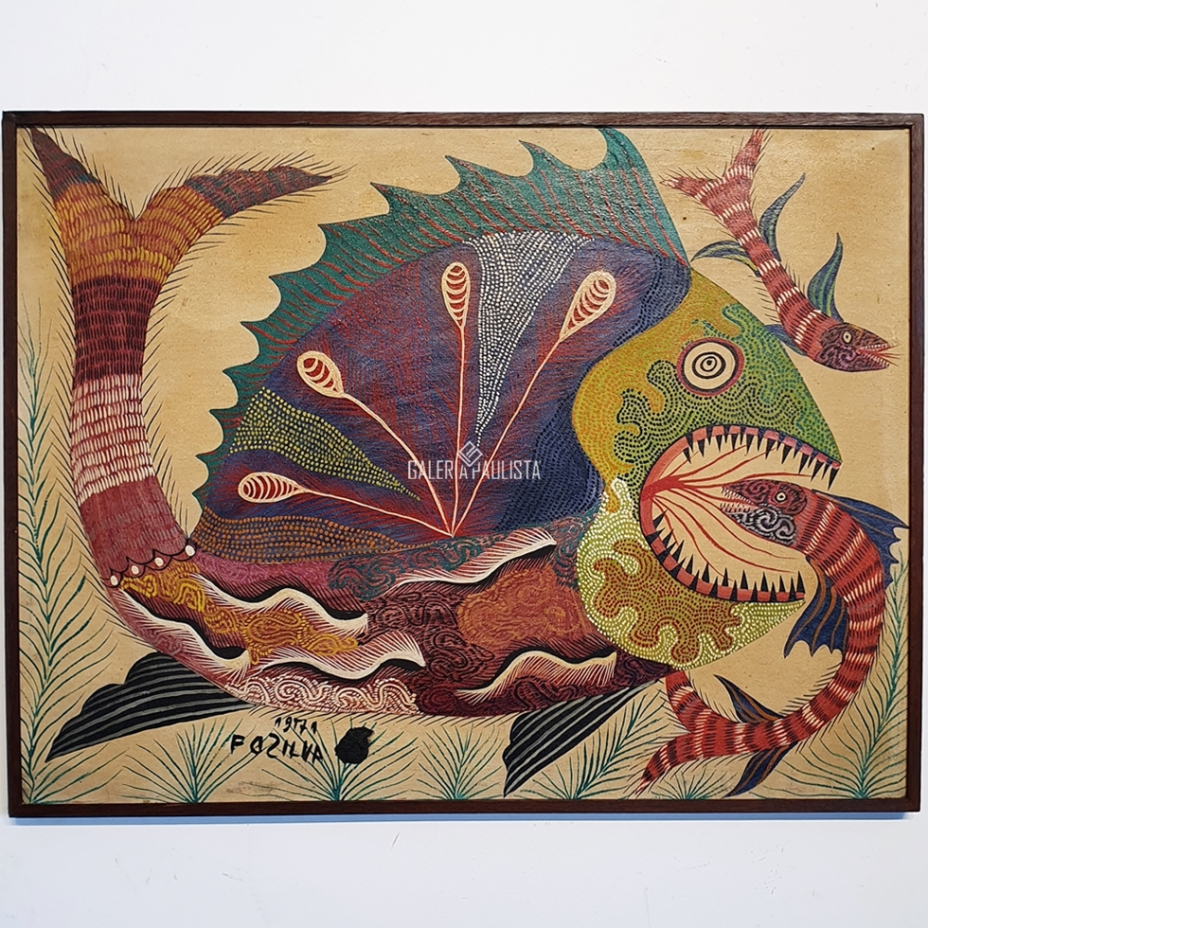CHICO DA SILVA "Peixes" Tempera-Guache S/ Tela -Med 54x70 cm (Obra) -Assinada e Datada 1971 no CIE -Com moldura em madeira.