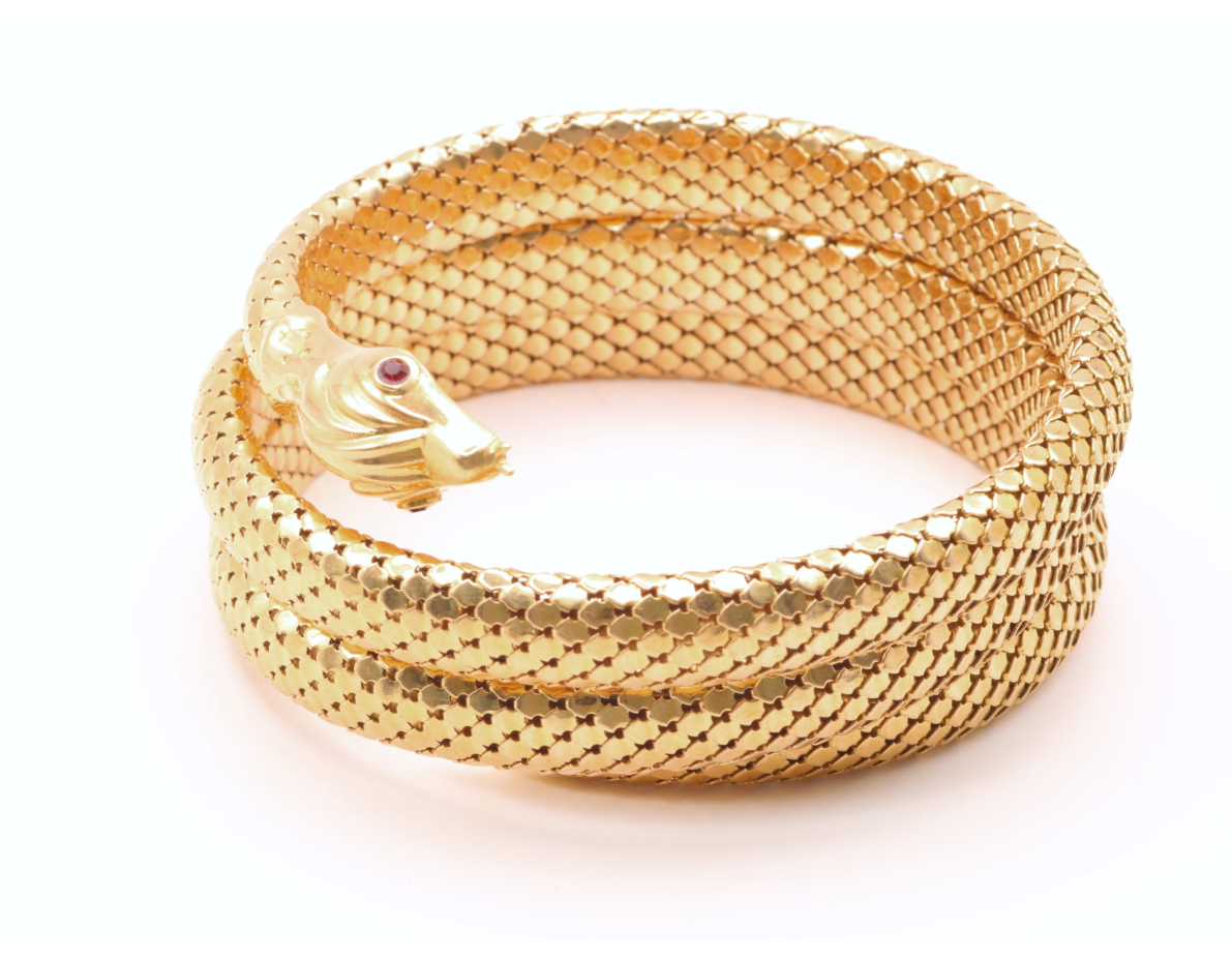 Pulseira de ouro amarelo 18k, tipo cobra com 3 voltas em mola.