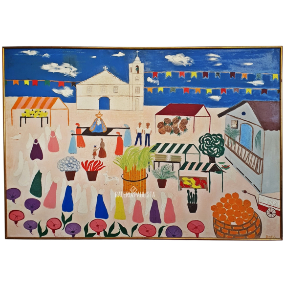 BERTHA de Moraes Novaes "Festa da Padroeira" Óleo Sobre Tela -Med 88 x 128 cm -Assinado no CID -Dec 70. Com moldura em madeira. SOBRE A ARTISTA: Pintora, amiga e aluna de Tarsila do Amaral de quem recebeu excelente crítica, também é Citada em Dossie de Artistas UNESP/Assis.