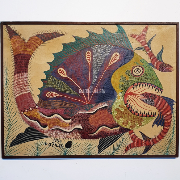 CHICO DA SILVA "Peixes" Tempera-Guache S/ Tela -Med 54x70 cm (Obra) -Assinada e Datada 1971 no CIE -Com moldura em madeira. Chico da Silva "Francisco Domingos da Silva" (nasceu na região do Alto Tejo, Acre, 1910 ou 1922/23 – Fortaleza, Ceará, 1985) foi um dos principais artistas sem treino artístico do Brasil na segunda metade do século XX. Seus trabalhos consistem em composições figurativas fabulares que apresentam seres mitológicos, animais fantásticos e personagens preenchidos por pontilhismo e fundos amplamente trabalhados. Além da fundação do Ateliê do Pirambu, Da Silva participou de importantes mostras, como a Bienal de São Paulo em 1967, e teve três trabalhos agraciados com menção honrosa na Bienal de Veneza, em 1966. Ao longo dos anos, a oficina criada por Chico foi tratada de forma dúbia pelo próprio artista. Apenas em 1977, em um evento realizado no Salão de Abril, Chico assumiu a existência do grupo. Sob coordenação do pintor, os cinco artistas realizaram em conjunto um grande painel, ação representada na exposição da Pina por meio de fotos e um vídeo super-8. Ateliê-Escola do Pirambú.