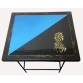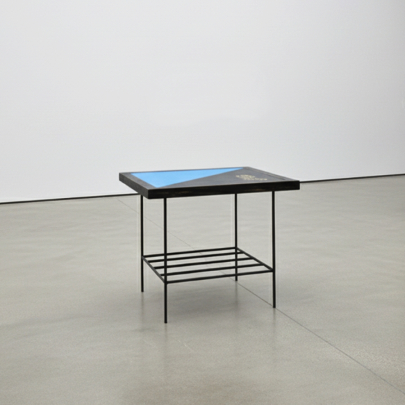 PALATNIK, Abraham - ATELIER ARTE VIVA "Mesa Azul e Preta em Metal e Pintura em Vidro" Med 50x60x50 cm -Pintura em vidro leitoso friável nas cores: azul, preto e desenhos ao centro na cor dourada. Mesinha Palatnik de Vidro e Ferro "do Atelier Arte Viva" -Possui a Etiqueta/Selo do Atelier Arte Viva de Arte Moderna e Decorativa, sobre sua base. Sem lascas ou trincas no vidro. Belíssima mesinha com a estrutura e amarração em ferro torneado com tinta sintética friável, adornado por belíssimo tampo em vidro leitoso com desenhos dourado. Vendida no estado/como atribuição.