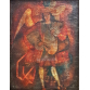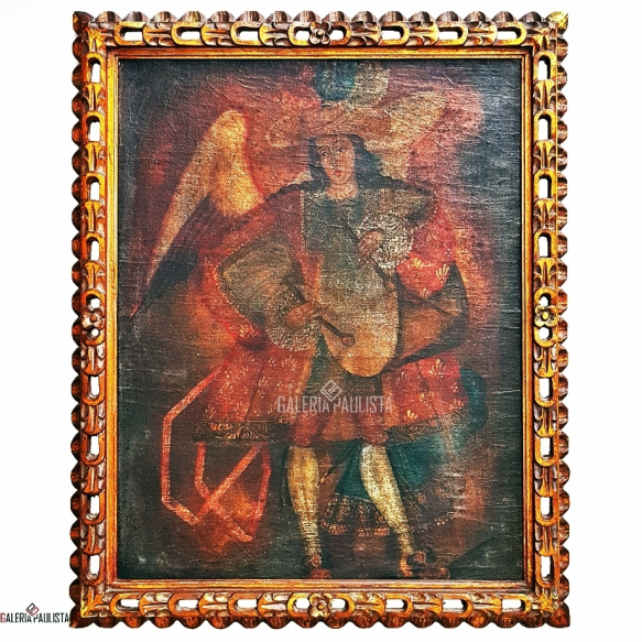 ESCOLA CUSQUENHA "Arcanjo" Óleo Sobre Tela -Med: 73 x 58 cm e 85x70 cm com a moldura. Séc XIX -Belíssimo e antigo quadro cusquenho com moldura em madeira com detalhes espelhados em sua borda. Assinatura não localizada.