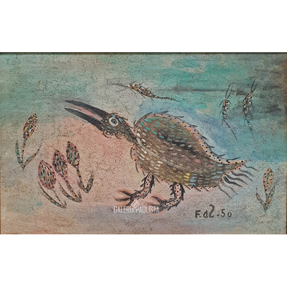 CHICO DA SILVA "Pássaro-1950" Guache Sobre Papel -Med 12x19 cm (Obra) -20x27 (ME) -Assinada e Datada 1950 no CID. Com moldura nova em madeira. SOBRE O ARTISTA: Chico da Silva "Francisco Domingos da Silva" (nasceu na região do Alto Tejo, Acre, 1910 ou 1922/23 – Fortaleza, Ceará, 1985) foi um dos principais artistas sem treino artístico do Brasil na segunda metade do século XX. Seus trabalhos consistem em composições figurativas fabulares que apresentam seres mitológicos, animais fantásticos e personagens preenchidos por pontilhismo e fundos amplamente trabalhados. Além da fundação do Ateliê do Pirambu, Da Silva participou de importantes mostras, como a Bienal de São Paulo em 1967, e teve três trabalhos agraciados com menção honrosa na Bienal de Veneza, em 1966. Ao longo dos anos, a oficina criada por Chico foi tratada de forma dúbia pelo próprio artista. Apenas em 1977, em um evento realizado no Salão de Abril, Chico assumiu a existência do grupo. Sob coordenação do pintor, os cinco artistas realizaram em conjunto um grande painel, ação representada na exposição da Pina por meio de fotos e um vídeo super-8.