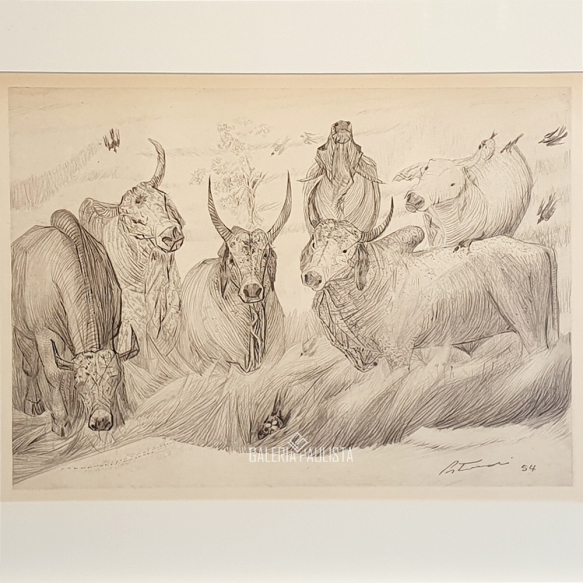 CANDIDO PORTINARI "Boiada, 1954" Print-RotoGravura P&B S/ Papel Westerpost -Med: 36x54 cm (Obra-ME) e 48x60 cm (quadro) -Assinat e Dat 954 Impressa no CI, na "matriz/chapa" -Obra/Prancha extraída do exemplar do Álbum nº 1421 "Mestres do Desenho" por Carlos Drumond de Andrade, editado pela Cutrix -Data: Déc 60 -Com moldura nova em madeira "tipo caixa", vidro de proteção e foamboard no verso. Estado de conservação: Ótimo.