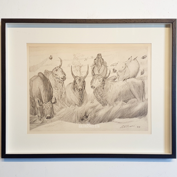 CANDIDO PORTINARI "Boiada, 1954" RotoGravura S/ Papel Westerpost -Med: 36x54 cm (Obra-ME) e 48x60 cm (Moldura) -Assinat e Dat 954 impr. no CI "chapa" -Obra/Prancha extraída do Álbum/Exemplar nº 1421 "Mestres do Desenho" por Carlos Drumond de Andrade, editado pela Cutrix -Data: Déc 60 -Com moldura nova em madeira "tipo caixa", vidro de proteção e foamboard no verso. Estado de conservação: Ótimo.