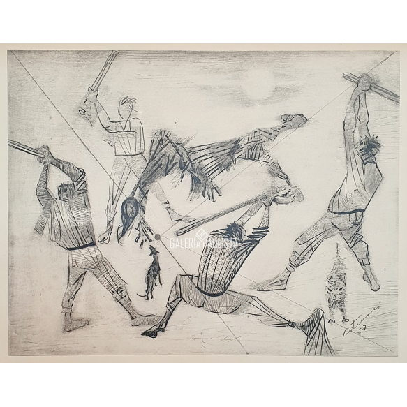 CANDIDO PORTINARI "Malhando Judas, 1957" RotoGravura S/ Papel Westerpost -Med: 36x54 cm (Obra-ME) -Assinat e Dat 57 impr. no CID na "chapa" -Obra/Prancha extraída Álbum/Exemplar nº 1421 "Mestres do Desenho" por Carlos Drumond de Andrade, editado pela Cutrix -Data: Déc 60 -Sem Moldura (nunca emoldurado). Estado de conservação: Ótimo.
