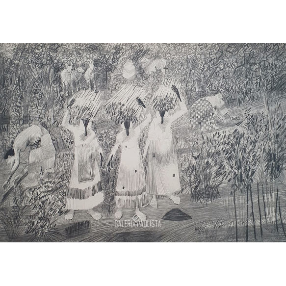 CANDIDO PORTINARI "COLHEITA - 1957" RotoGravura S/ Papel Westerpost, Emoldurada -Med: 36x54 cm (Obra-ME) -Assinado e Dat 57 impresso no CID na "chapa" -Obra/Prancha extraída Álbum/Exemplar nº 829 "Mestres do Desenho" por Carlos Drumond de Andrade, editado pela Cutrix -Data: Déc 60 -Com nova moldura, vidro de proteção e foamboard anti-mofo no verso. Estado de conservação: Ótimo.