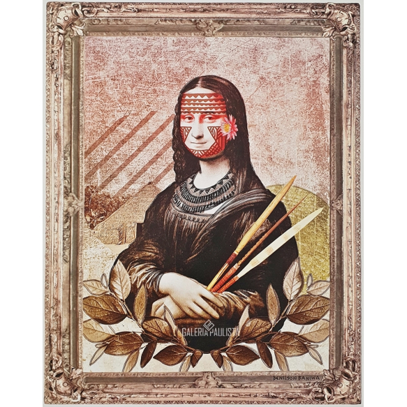 DENILSON BANIWA "Gioconda Kunhã" Print-Impressão S/ Papel Hahnemühle -Med: 42x30 cm -Assin e Dat 2022 manualmente no CID pelo Artista. Sem moldura (nunca emoldurada). Estado de conservação: Ótimo. SOBRE O ARTISTA: Recentemente o artista participou da Exposição "ESCOLA PANAPANÁ" na Pinacoteca-SP em 2023: A instalação é uma construção em três pavimentos ocupando o Projeto Octógono Arte Contemporânea da Pinacoteca Luz, é concebida para ser um espaço experimental de aulas de línguas e culturas indígenas, arte e música, com curadoria de Renato Menezes. DENILSON BANIWA é o primeiro artista indígena a ocupar o Projeto Octógono Arte Contemporânea da Pinacoteca Luz. MAIS SOBRE O ARTISTA: Denilson Baniwa, 1984, do povo indígena Baniwa é natural do Rio Negro, interior do Amazonas. É artista-jaguar e atualmente reside no Rio de Janeiro. Seus trabalhos expressam sua vivência enquanto Ser indígena do tempo presente, mesclando referências tradicionais e contemporâneas indígenas e se apropriando de ícones ocidentais para comunicar o pensamento e a luta dos povos originários em diversos suportes e linguagens como canvas, instalações, meios digitais e performances. Vencedor do PIPA Online 2019. Indicado ao PIPA 2019 e 2021. As vezes o desafio não é ocupar posições. Por exemplo, quando as que existem não servem, é necessário criar algo novo. denilson Baniwa é um artista indígena; é indígena e é artista, e seu ser indígena lhe leva a inventar um outro jeito de fazer arte, onde processos de imaginar e fazer são por força intervenções em uma dinâmica histórica (a história da colonização dos territórios indígenas que hoje conhecemos como Brasil) e interpelações a aqueles que o encontram a abraçar suas responsabilidades.