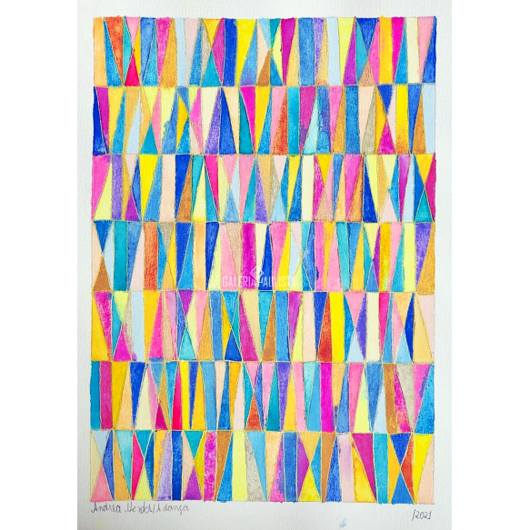 ANDREA MENDES "A Dança - Série Vitrais" Aquarela Original e Canetas Metalizadas S/ Papel 100% algodão -Med 40x30 (obra) 44x34 cm (Mold). Com moldura branca tipo caixa - Assinado no CIE e com assinatura em marca d’água da artista no CID. Data: 2021. SOBRE A ARTISTA ANDREA MENDES: Andrea Mendes é brasileira, nascida em Anápolis - Goiás em 1976. É pintora e fotógrafa e vive em São Paulo. Teve uma galeria de Arte em Brasília, a Andrea Mendes Galeria de Arte, em sociedade com Aurélio Flôres entre 2008 e 2010. Começou no universo da arte atuando como fotógrafa, de tanto escutar que suas fotos pareciam pinturas foi estudar aquarela e hoje se dedica a um trabalho autoral em pintura, se utilizando de várias técnicas, entre elas aquarela, guache, óleo e tinta acrílica, sobre papel e sobre tela.Em 2019 começou a fazer arte urbana, está se especializando na técnica e a cidade de São Paulo já conta com vários muros pintados pela artista. Realizou exposições individuais e coletivas em museus, centros culturais e galerias de arte no Brasil, Holanda, Alemanha, EUA, Portugal e Argentina. Tem trabalhos em coleções públicas e privadas no Brasil, Inglaterra, Holanda, Alemanha, Polônia, França, Portugal, Sri Lanka, EUA e Argentina. Prêmios e Bienais: Foi Selecionada com duas obras para a Bienal Naifs do Brasil - SESC - 2020 Recebeu Menção honrosa no concurso Hasselblad Masters 2008 Finalista no Prêmio SESC Marc Ferrez de Fotografia 2007 Exposições Individuais: Série Casa Vazia - Museu MACRO de rosário - Argentina - Exposição integrante do Festival Internacional de Fotografia - Encuentros Abiertos -Agosto / 2010 Série Re-flexos, luz e sombras - Fotografia e Psicanálise - Centro Cultural Correios - RJ Abril / 2007 Série Retratos de uma luta - Andrea Mendes e Grupo Teatral Pirei na Cenna - Teatro do Oprimido - Galeria Abraço - Lisboa - Portugal -Fevereiro / 2010 Série Re-flexos, luz e sombras - Fotografia e Psicanálise - ECCO - Espaço Cultural Contemporâneo - Brasília - Exposição integrante do FOTO ARTE 2007 e do Festival of Ligh - Brasília - DF - outubro / 2007 Série Re-flexos, luz e sombras - Fotografia e Psicanálise - Galeria da Aliança Francesa de Salvador - BA - Festival A Gosto da Fotografia - BA - agosto / 2007 Série Re-flexos, luz e sombras - Blow Up Gallery - Amsterdam - fevereiro/março/abril / 2007.