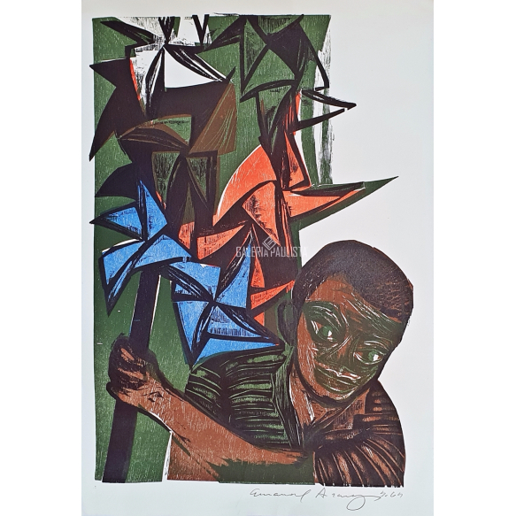 EMANOEL ARAUJO "Menino com Catavento" Rara Xilogravura Color S/ Papel - 60x40 cm -Assinado e Dat 65 no CID a lapis pelo artista. Possui Chancela do Editor no CIE -Med Total 70x54 cm com a moldura nova, passepartout, vidro de museu anti-reflexo e foamboard no verso. Ano 1965. Estado de conservação: Ótimo.
